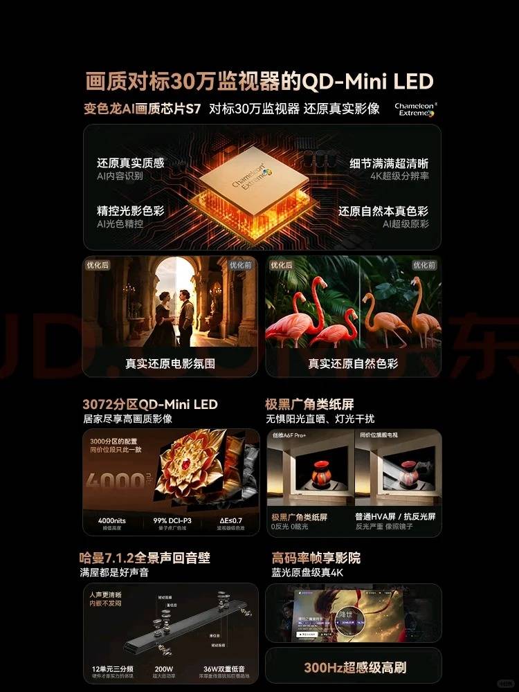 这里的关键不只是“分区多”“亮度高”,而是分区密度与低反光学堆栈的协同:屏幕叠加 LR 低反层、STW 全视角补偿层和 AG 防眩层,尽量把环境光反射压到极低水平,相当于在提升面板本身对比度的同时,把 ACR(环境光对比度)也拉上一个台阶。对于有大落地窗、强环境光的客厅,这样的类纸屏 + 高分区 Mini LED 组合,在暗场细节保留、明部高光控制和侧视色彩还原上,确实比同价位常规 Mini LED 方案要“高半档”。