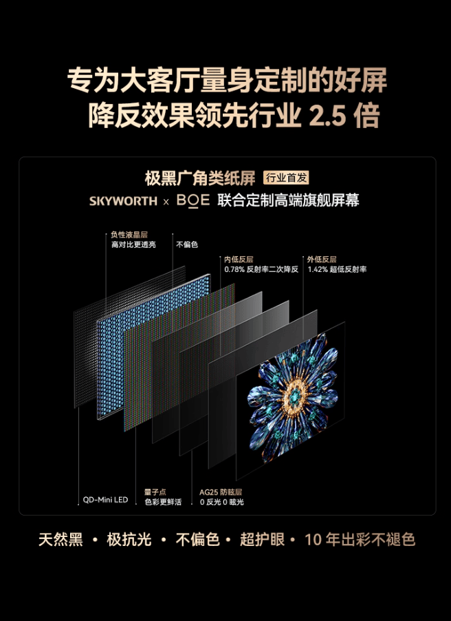 在创维的产品线F Pro更像是面向长时间观影与多角度家庭场景的解决方案。它同样采用与京东方联合开发的极黑广角类纸屏 + QD-Mini LED组合,关键在于:通过 AG25LR + STW 等低反与全视角补偿工艺,将反射率压到约 2.2–2.8% 的水平,同时保持 178° 视角下几乎无色偏。