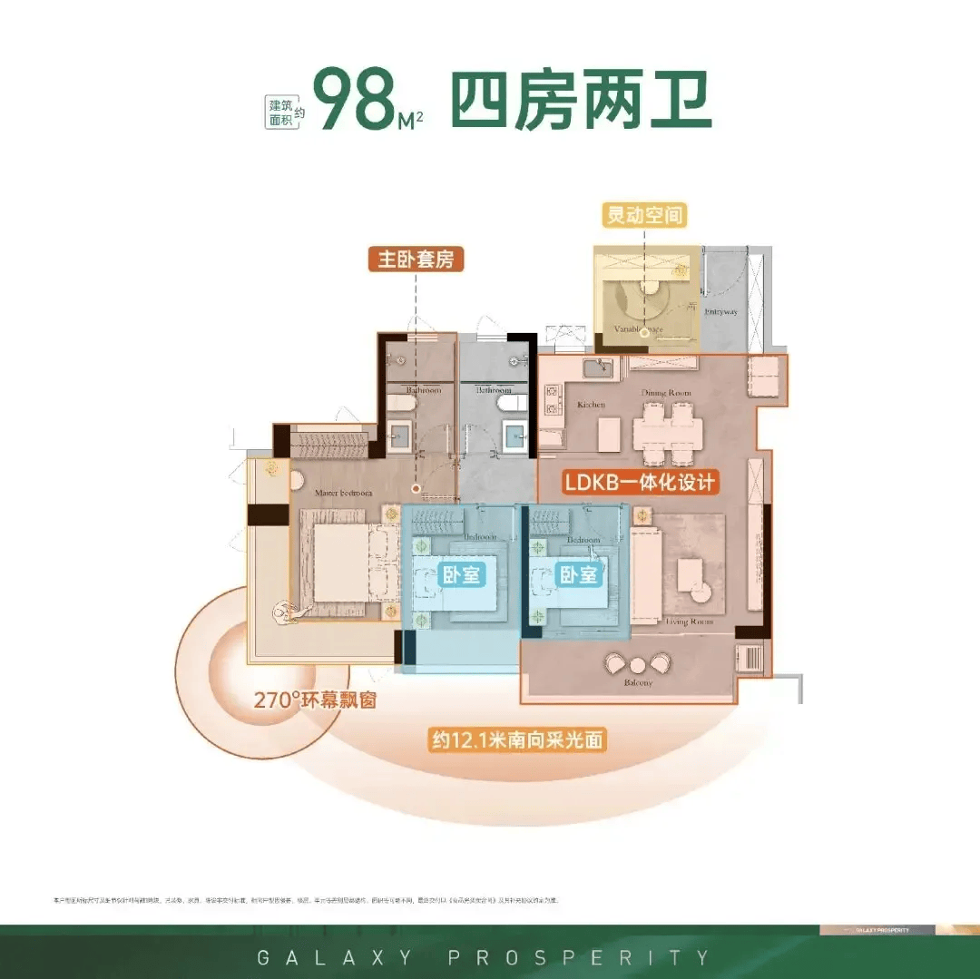 98㎡四房两厅两卫是项目的热门户型,深受三口之家的青睐。户型采用四开间采光设计,让每个房间都能享受到充足的阳光;预留的S墙收纳空间,能有效解决家庭的收纳难题,让家居环境更整洁有序。一体化大宽厅搭配开放式厨房的设计,不仅提升了空间的视觉开阔感,也增强了家庭成员之间的互动交流,空间利用率拉满。随着家庭人口的增加,这个户型也能轻松满足三口之家的升级需求。