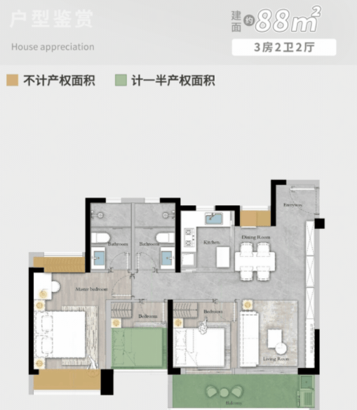 88㎡三房两厅两卫是刚需入门的优选户型。该户型采用三面采光、四开间朝南的设计,让室内空间拥有充足的采光和通风,有效避免了阴暗潮湿的问题。主卧配备270度环幕飘窗,不仅拓展了室内的视野,也为业主提供了一个休闲观景的小天地;5.4米阔景阳台则进一步提升了空间的通透感,无论是晾晒衣物还是摆放休闲桌椅,都十分实用。对于刚组建的小家庭来说,这个户型空间布局合理,总价友好,完全能满足日常居住需求。