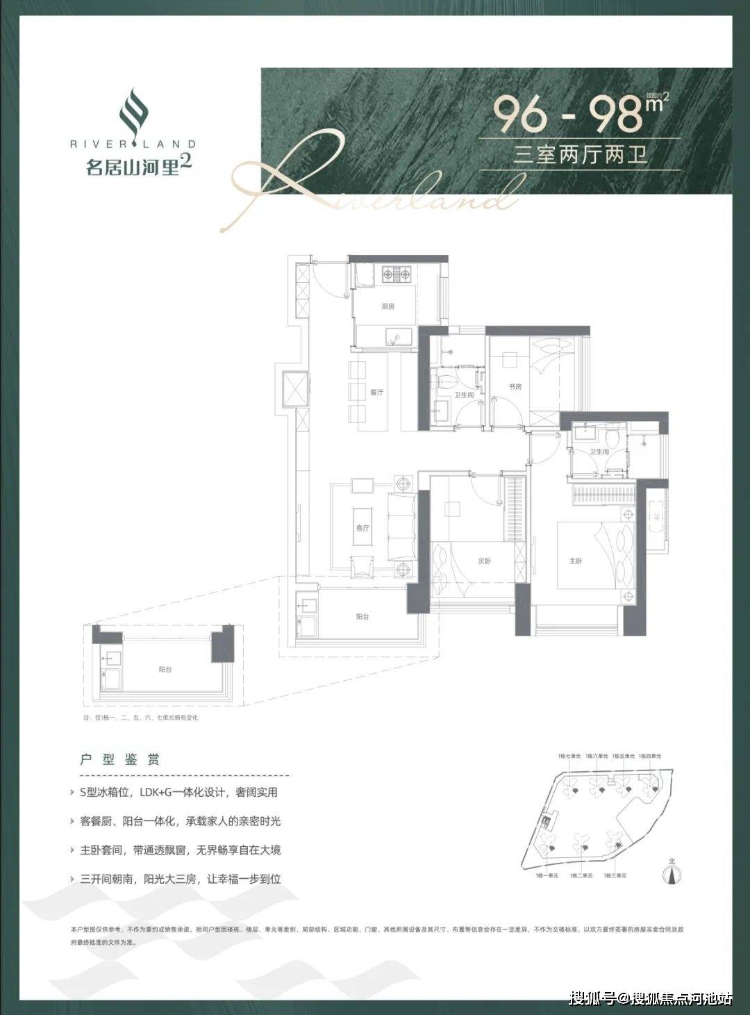95㎡的3房2厅2卫,1-7单元03户型,设计的是经典竖厅格局,餐客厅一体化,客厅3.5米开间,三开间朝南,3个卧室分别做到了主卧11.8㎡/次卧9.2㎡/次卧6.1㎡(实测面积,去掉墙体),U型厨房,卫生间干湿分离,得房率:73.86%(不含赠送),阳台1.5米进深,西南朝向。98㎡的3房2厅2卫,1-7单元05户型,设计的是经典竖厅格局,餐客厅一体化,客厅3.5米开间,S墙设计预留冰箱位,三开间朝南,3个卧室分别做到了主卧12.39㎡/次卧9.54㎡/次卧6.11㎡(实测面积,去掉墙体),U型厨房,得房率:73.86%(不含赠送),阳台1.5米进深,东南朝向。
