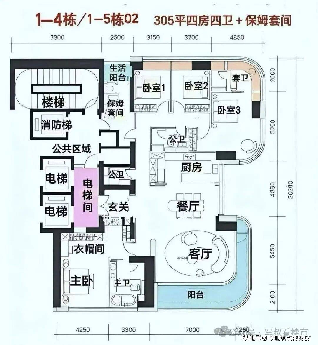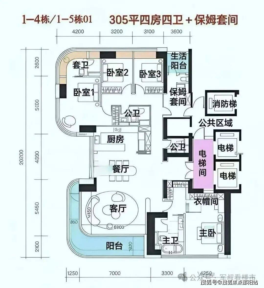 1D\1E栋:约302㎡户型4+1房2厅4卫,有2栋,每层两户,1D栋49层,182.77米,1E栋43层,161.77米,均为西南向,3梯2户,看深圳湾海景,落位于地块西侧南北通;总价预计4360-5900万!