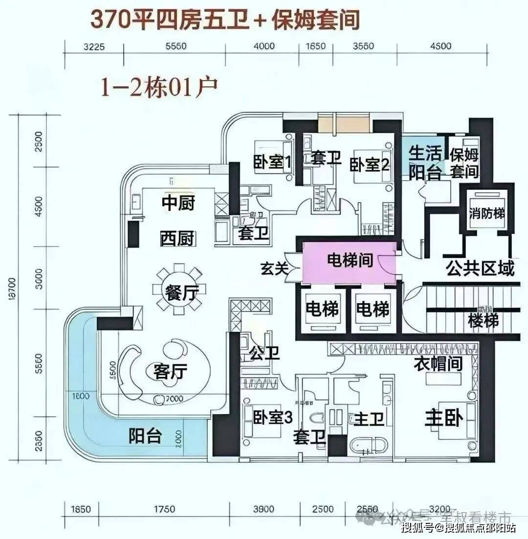 1B栋:约370㎡户型4+1房2厅3卫,仅1栋,每层两户,47层,180.17米,均为东南向,落位于地块东北侧,南北通;5梯2户,总价预计5360-7250万!