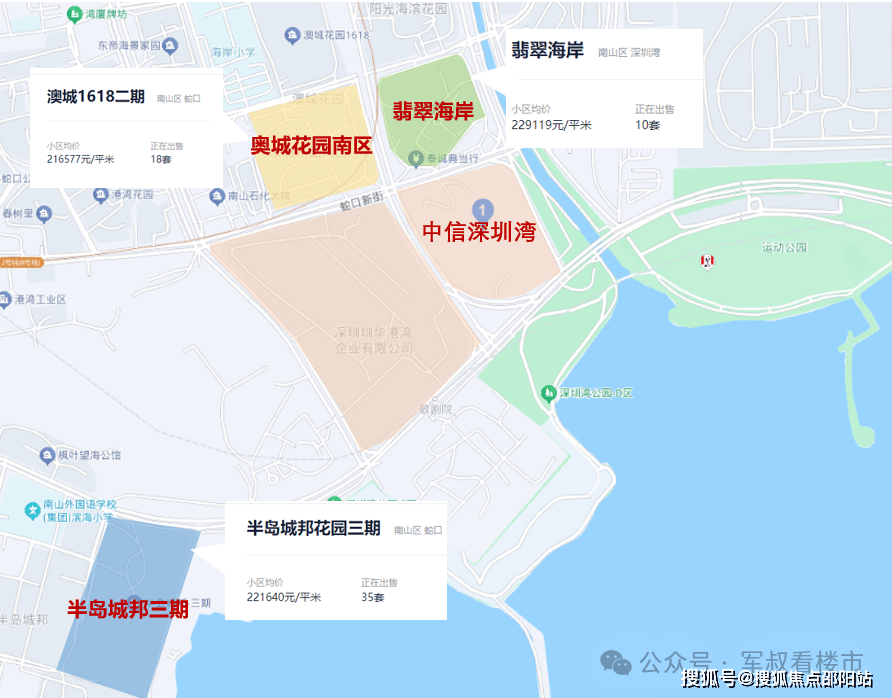 从价格来看,距离中信深圳湾目最近的小区:翡翠海岸、半岛城邦花园三期、奥城花园南区等二手房挂牌价均在22万/㎡左右(来源于贝壳),甚至巅峰期价格一度到达30万+/㎡。