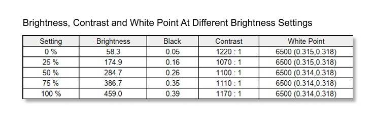 接下来考察面板的核心素质。在100%亮度设置下,该显示器的实测亮度达到了459 nit。同时,其黑场亮度为0.39nit,并保持了稳定的对比度,在100%亮度下对比度实测可以达到1170:1。
