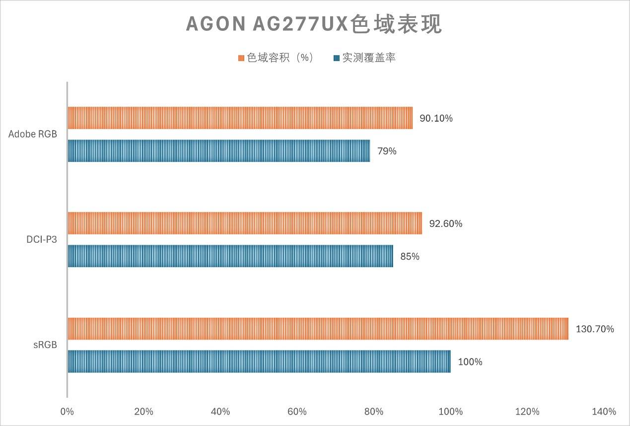 在色域覆盖方面,AGON AG277UX的表现较为不错,不仅能实现对sRGB色域的100%覆盖,同时还能覆盖85%的DCI-P3色域和79%的Adobe RGB色域。