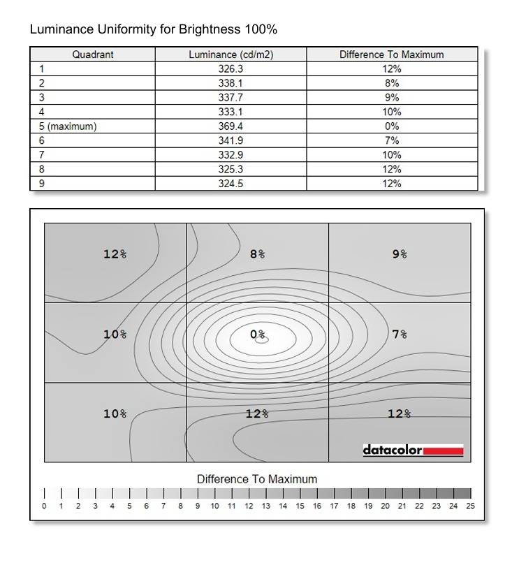 在亮度均匀性方面,该显示器在100%亮度下的最大亮度位于屏幕中央的5号区域。最大亮度差异百分比为12%,出现在1、8、9号区域。整体而言,其亮度均匀性尚可,部分区域差异略大。