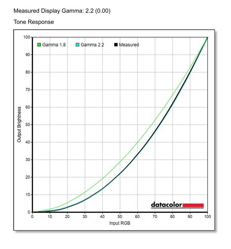 在 Gamma 测试中,该显示器的实测 Gamma 值为2.2。从曲线走势可以看到,其曲线曲线几乎完全重合,表明其色调响应表现出色,与标准吻合度极高。