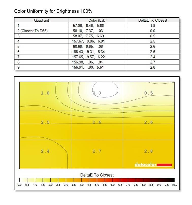 在色彩均匀性方面,该显示器整体的表现良好。在100%亮度下,屏幕各象限的色彩差异 Delta E的最大值仅为2.8(位于9号区域),而最接近D65的区域位于2号区域。