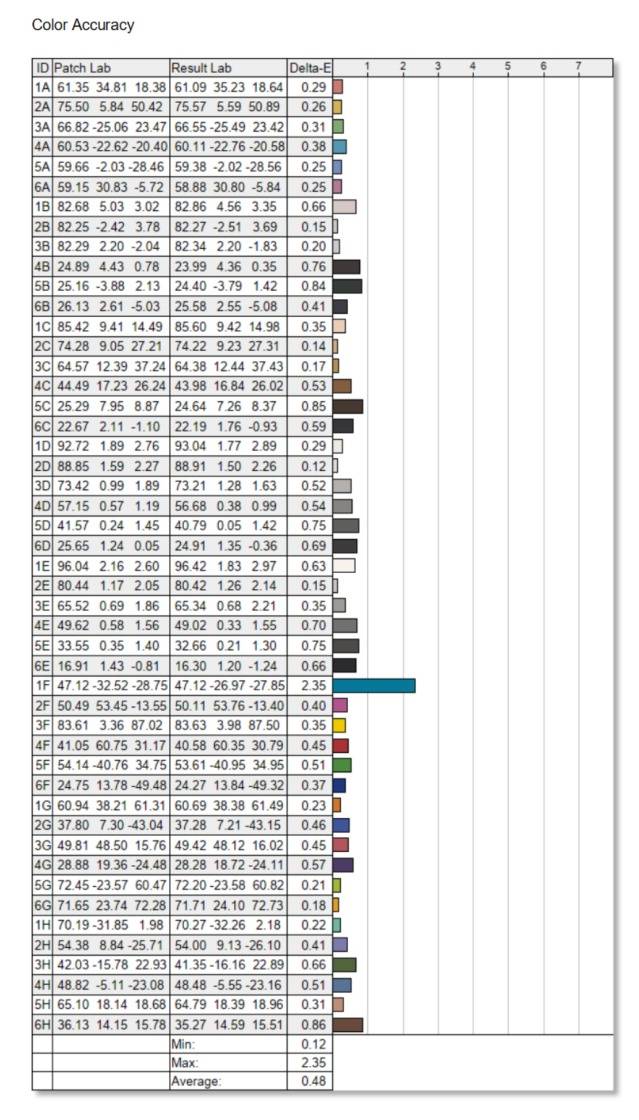 在最重要的色准测试中,AGON AG277UX的表现相当优秀 。色彩差异Delta E的平均值仅为 0.48 ,最大值也仅为 2.35 ,表明色彩还原的精度极高 。
