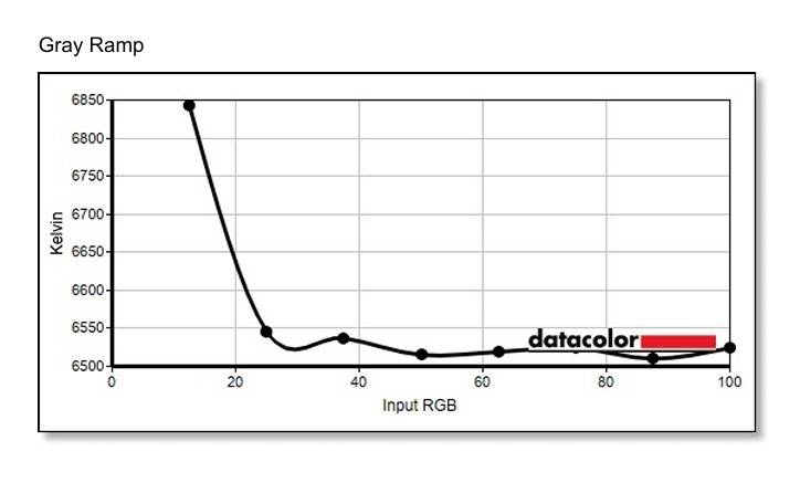 在灰阶色温测试中,显示器的色温在中低亮度区间波动较大,但在中高亮度区间保持相对稳定。色温在较低的灰阶时达到了峰值约6850K。随后急剧下降,在20%灰阶时约为6550K。从40%灰阶至100%灰阶的亮度区间,色温保持得相当平稳,基本稳定在6500K左右。