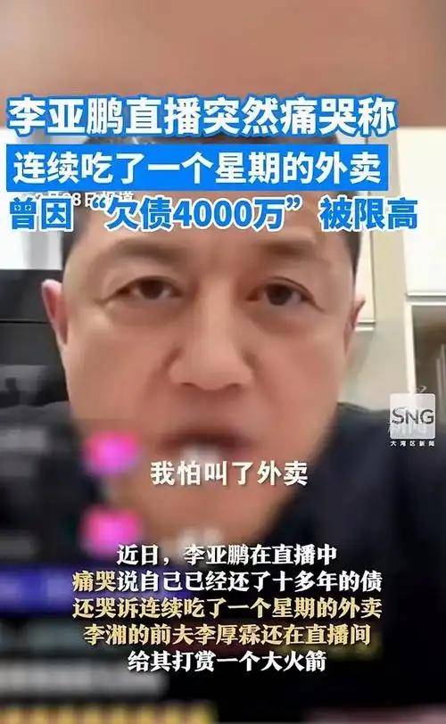 就连网传负债累累,被限制高消费的李亚鹏人生至暗时刻,让他崩溃痛苦,向网友卖惨,也不过是一连多天靠吃外卖度日。