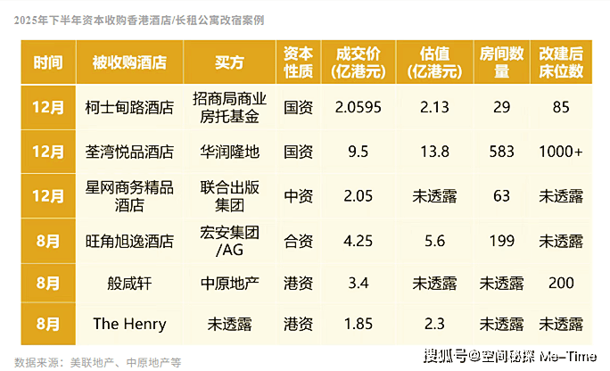 以上并非2025年内国资“进场”的个案。继2025年4月荃湾悦品酒店宣布招标放售后,12月,有消息称该物业已被华润隆地斥资约9.5亿港元买入,目前正在进行尽职审查,日后将用作学生公寓。