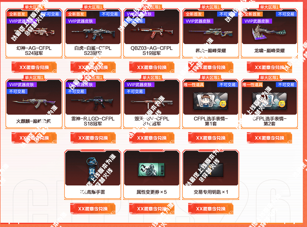 当CFer们攒够一定数额的徽章令时可来到该版块兑换自己心仪的道具,全新首发的幻神-AG-CFPL S24冠军、白虎-白鲨-CFPL S23冠军、裁决-巅峰荣耀、龙啸-巅峰荣耀等道具都可以在这里兑换!