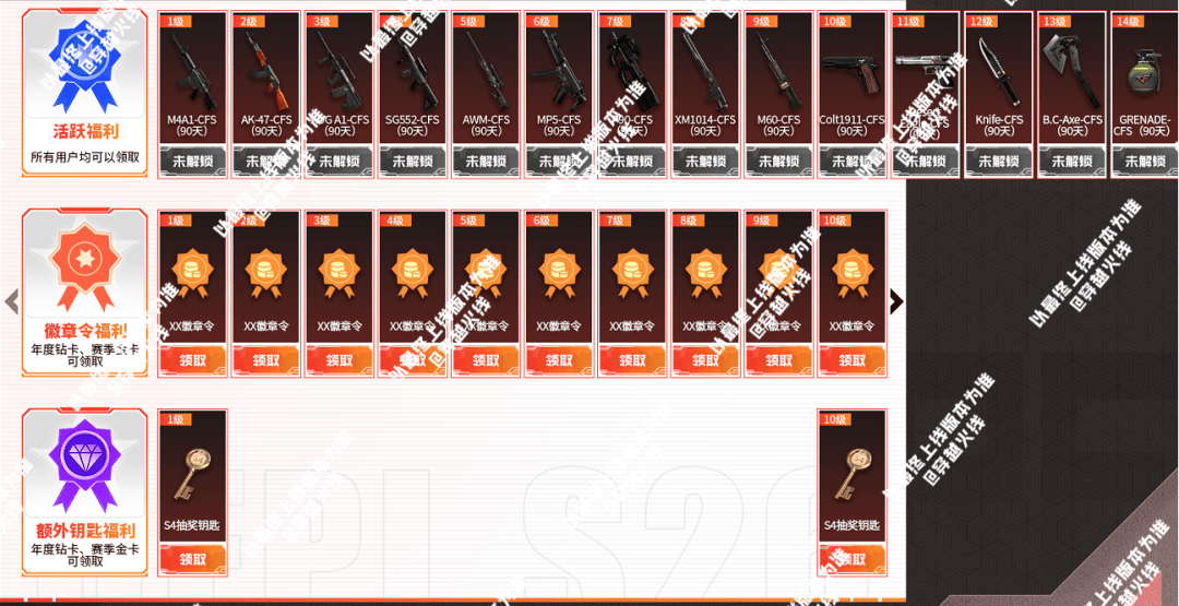 本次赛季卡奖励共分为活跃活动、徽章令福利和额外钥匙福利这三部分。所有CFer均可获取活跃福利部分的奖励,开通指定路线后还能额外获得徽章令、抽奖钥匙等超多内容,年度钻卡、赛季金卡用户 通行证等级每10级都有钥匙赠送,此处三条线等级通用。