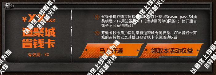 CFer可选择在本活动页面开通道聚城省钱卡,拥有道聚城省钱卡用户在购买活动产品时额外获赠指定数量的Season Pass S4抽奖钥匙+周边福袋,同时享有多项省钱卡专属权益。