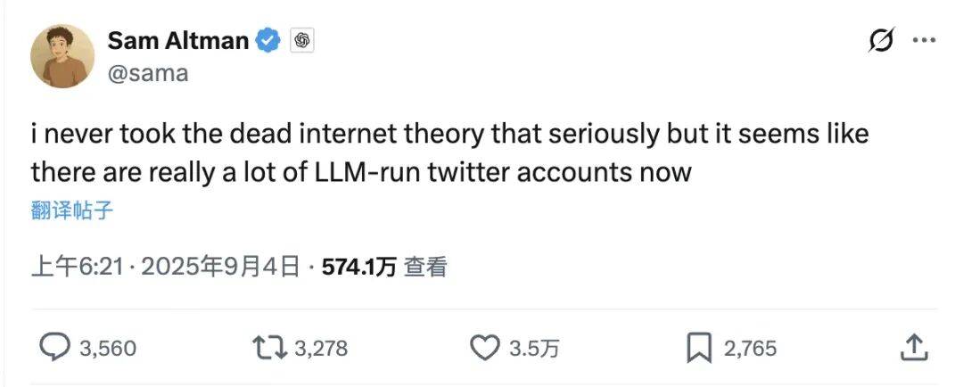 类似的事件正越来越多地出现在AI讨论中,甚至OpenAI的首席执行官山姆·奥特曼(Sam Altman)也曾在X上回应“互联网已死理论”(Dead Internet Theory)的迹象——社交媒体中存在大量由语言模型生成的空洞评论,制造出了一种“生命的幻觉”。AI能够迅速生成未经版权方许可的拟真文本,真人创作者的声音则逐渐被淹没。